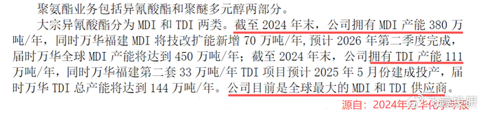 巨额资金投入下,万华化学的产能储备也正加速落地。截至2024年底,公司聚氨酯(MDI+TDI)总产能已达591万吨/年,稳坐全球最大MDI、TDI供应商宝座。