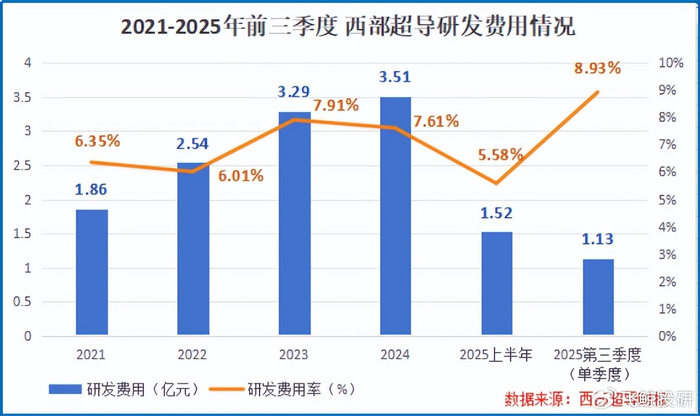 2025年第三季度,西部超导单季研发费用高达约1.13亿元,同比增幅超过114%,当季度研发费用率高达8.93%。
