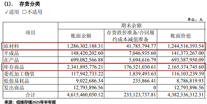 2025年半年报显示,佰维存储存货金额达43.82亿元。其中,有12.45亿元的“原材料”,有21.65亿元的“库存商品”,这两者合计占总存货的77.82%。