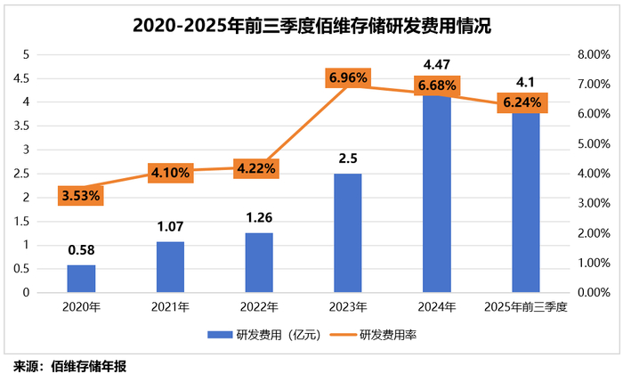 2020-2025年前三季度,佰维存储的研发费用逐年增加,累计投入费用高达14亿元;研发费用率也从3.53%提升至6.24%。