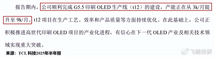 2025年上半年,公司已顺利完成G5.5印刷OLED生产线(t12)的建设,产能正在从3K/月提升至9K/月。
