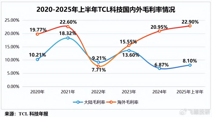 2023-2025年上半年,TCL科技的海外毛利率显著高于大陆内地。