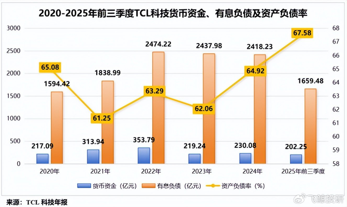 截至2025年三季度末,TCL科技货币资金仅202.25亿元;而有息负债却高达1659.48亿元,是公司货币资金的整整8倍多。