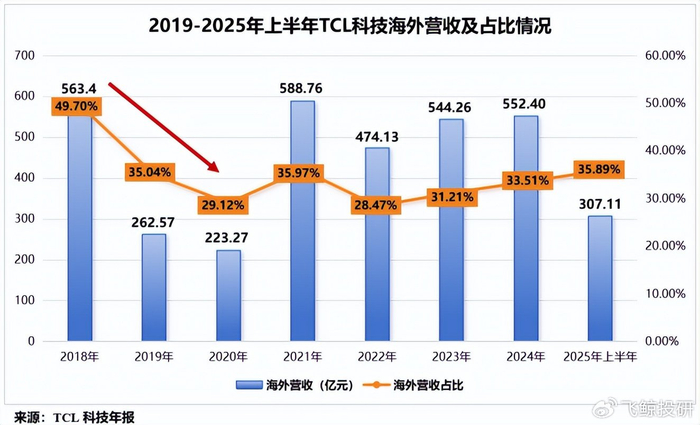 2019-2024年,TCL科技的海外营收虽从262.57亿元跃升至552.4亿元,但营收占比却始终维持在30%左右的水平。
