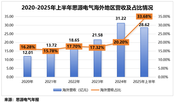 2020-2024年,思源电气海外地区营业收入从12.01亿元攀升至31.22亿元,海外营收占比也从16.28%增长至20.2%。