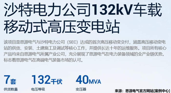 该项目是思源电气与沙特SEC达成的首次高压移动变交付,且全部核心产品均由思源旗下产业公司自主提供。