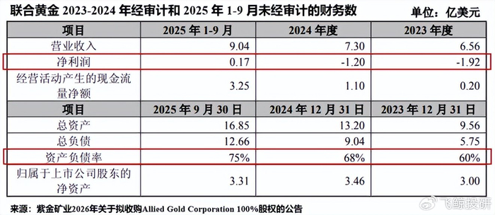 此外,联合黄金的负债也较高。截至2025年三季度末,该公司的资产负债率高达75%。