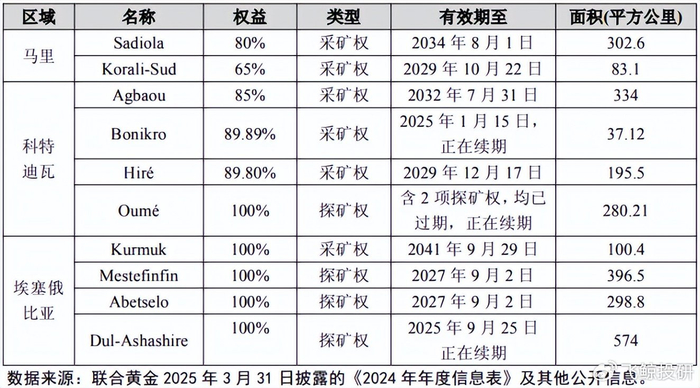 目前,联合黄金在马里、科特迪瓦及埃塞俄比亚三国总计持有6项采矿权及5项探矿权。