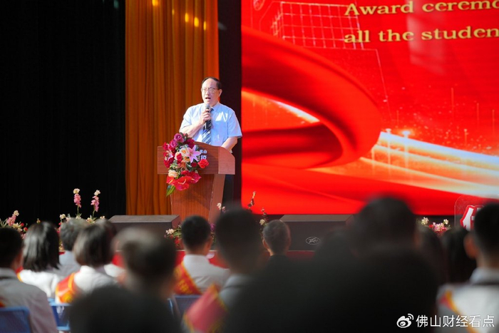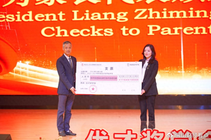广东德翰教育投资有限公司、佛山市三水区北博德翰外国语学校董事长梁志明先生上台,为奖学金生家长代表颁发了优才奖学金支票。奖学金彰显董事会关爱学子、回馈社会的教育情怀。