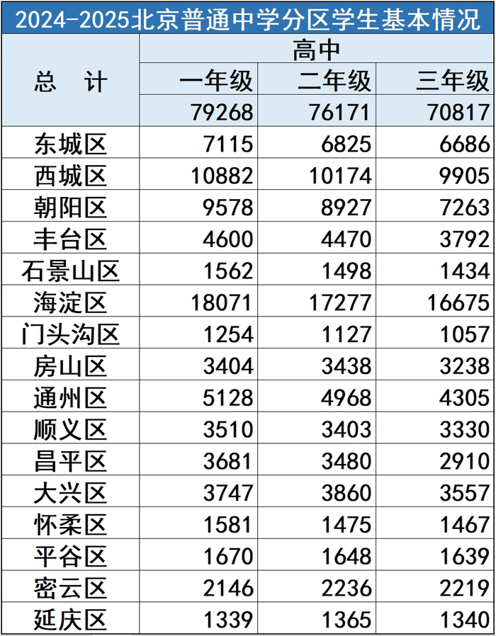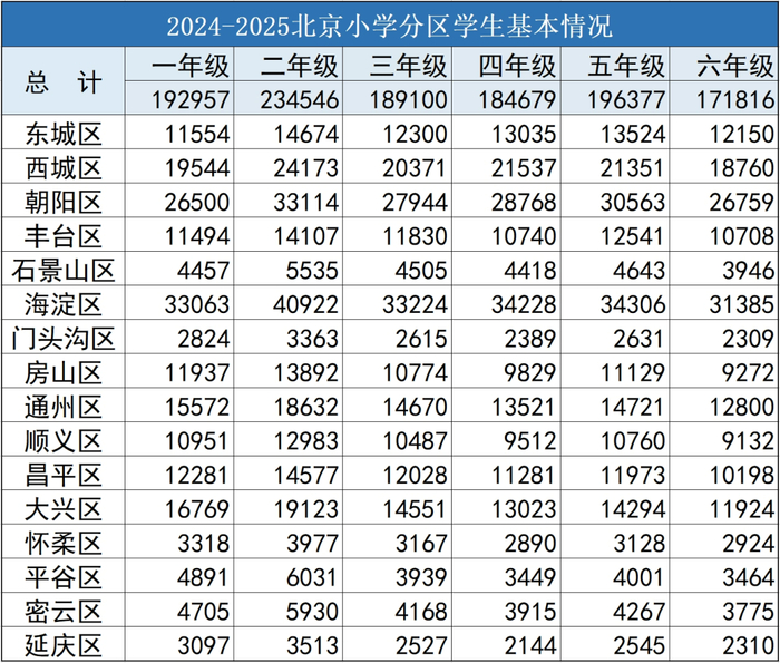其中,2024年北京16区六年级在校生为171816人,初三在校生为105005人,高三在校生70817人,京教君给大家整理了相关数据。