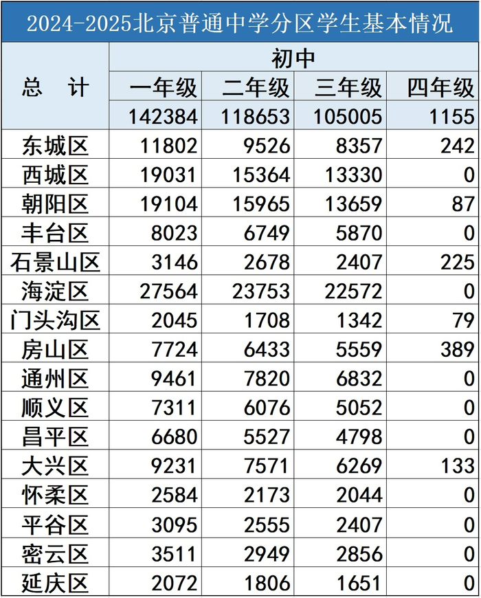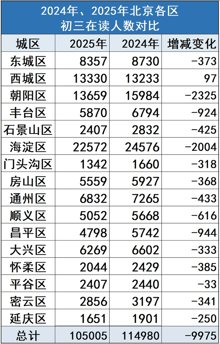 根据数据分析,2024北京16区初三在校人数是105005人,2023年发布的数据中初三在校生人数是114980人。2024年较2025年减少9975人,其中海淀、朝阳等区占了减少总人数的近一半,而西城是唯一人数增加的城区。但是从初中各年级在校生人数来看,未来三年北京中考人数或将呈现显著上升趋势!