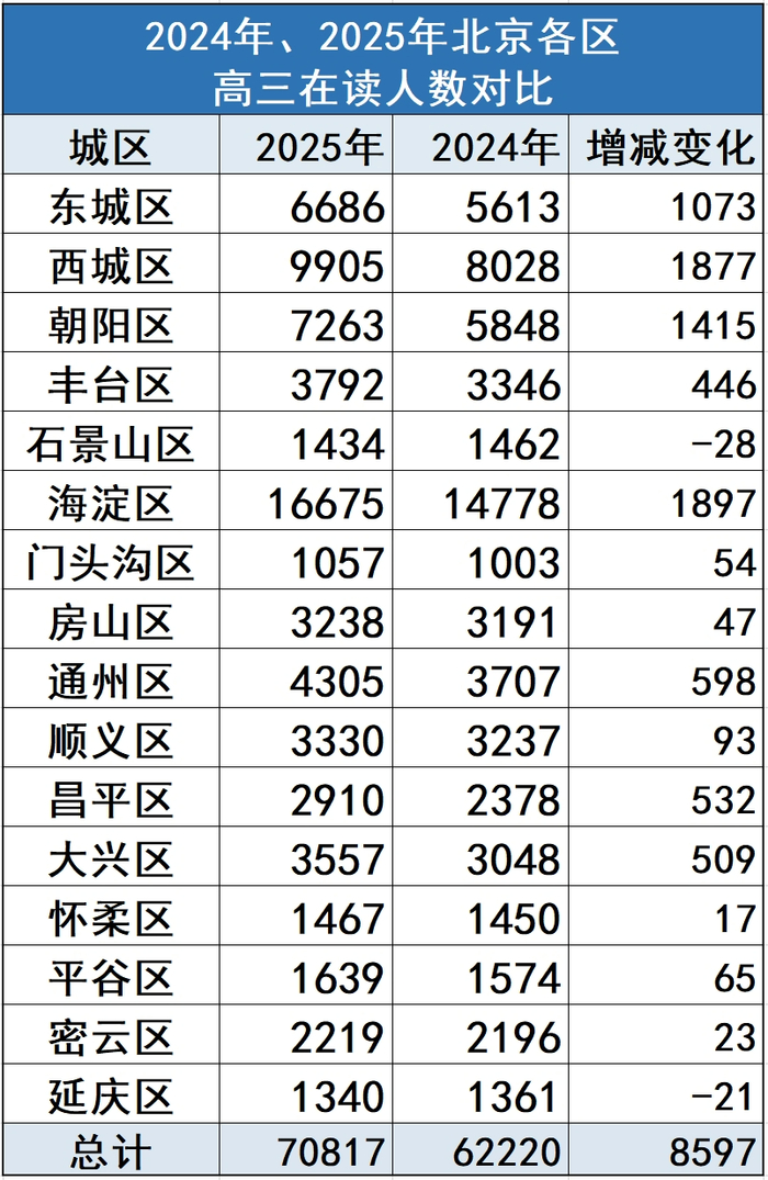 结合往年数据可以看出,高中生在校生人数逐年攀升。2024年高中三年级在校生人数为62220人,而今年是70817人,增加8597人,有大幅上涨,尤其是东西海朝四区增幅明显。按照目前中小学在校生人数分布情况,这一上涨趋势将在未来相当一段时间保持稳定。
