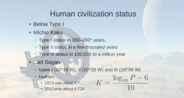 反过来利用公式计算出:现在的人类文明 K=0.725527。以3%的增长率,我们将在2233年左右可以达到一级文明水平。