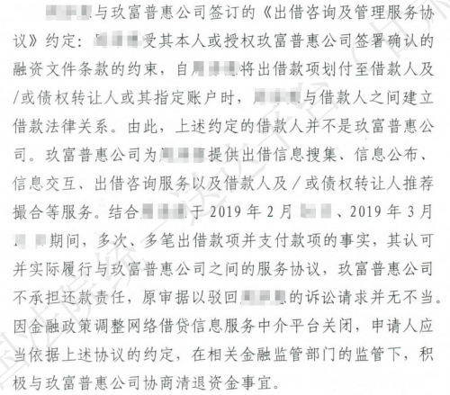 甘肃省高院裁定书中明确表述,出借人与玖富普惠公司签订的《出借咨询及管理服务协议》约定:自出借人将出借款项划付至借款人及 /或债权转让人或其指定账户时,出借人与借款人之间建立借款法律关系。由此,上述约定的借款人并不是玖富普惠公司。玖富普惠公司为出借人提供出借信息搜集、信息公布、信息交互、出借咨询服务以及借款人及/或债权转让人推荐 撮合等服务。结合出借人于2019年2—3月期间,多次、多笔出借款项并支付款项的事实,其认可并实际履行与玖富普惠公司之间的服务协议,玖富普惠公司不承担还款责任,原审据以驳回出借人的诉讼请求并无不当。