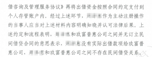 案件审理时,甘肃省高院认为本案的焦点问题是:出借人和玖富普惠公司之间是否存在民间借贷关系。该关系成立应以双方具有借贷合意且款项实际交付为要件,缺一不可。依据兰州中院原审查明的事实:出借人与玖富普惠签订《出借咨询及管理服务协议》,再将出借资金按照合同约定支付到个人存管账户内。出借人作为主动注册操作的当事人,应当对上述材料内容明确知晓并认可法律后果。裁定书中明确提到,出借人和玖富普惠公司之间并无订立民间借贷合同的意思表示,出借人没有实际出借款项给玖富普惠公司,出借人和玖富普惠公司之间不存在民间借贷关系。