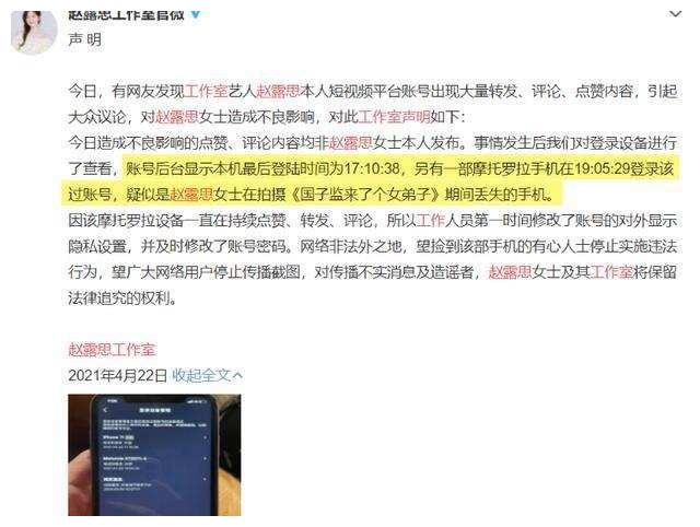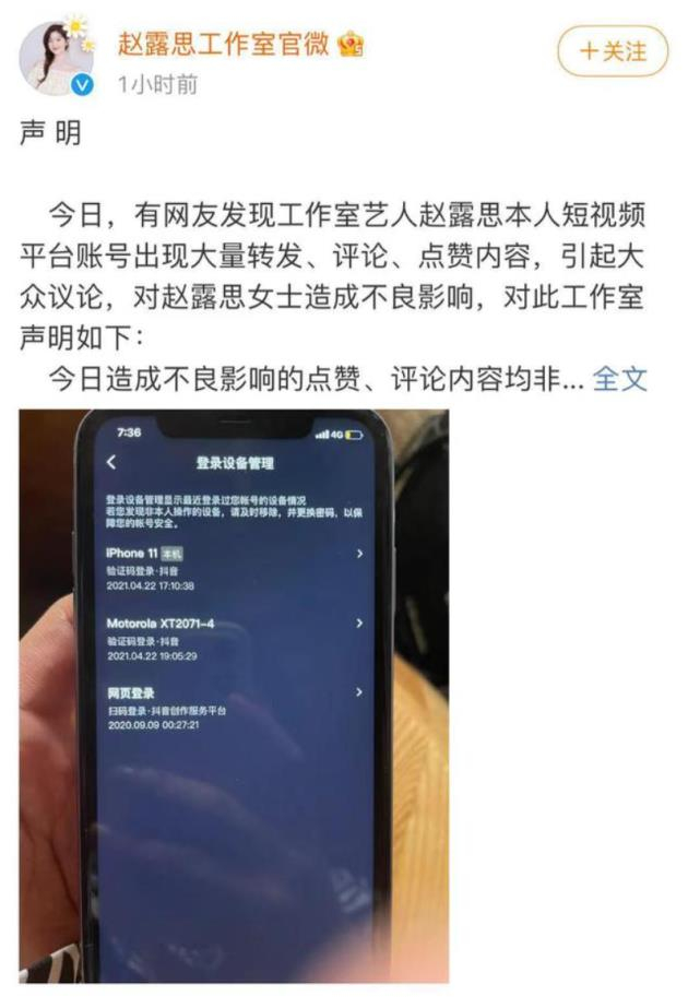随后,赵露思工作室发表声明称,“点赞、评论内容均非赵露思女士本人发布”,并出示了一张不同手机登录该账号的截图,工作室表示,赵露思去年遗失了手机,目前已更改了密码。