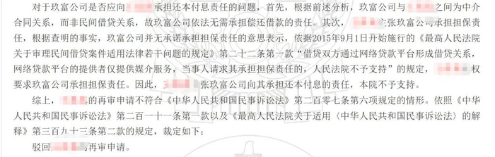 在本案中,最高院认为案件审查重点为:王某与玖富普惠之间是否为民间借贷法律关系;玖富普惠是否应向王某承担还本付息的责任。根据查明的事实,最高院认定,王某和玖富普惠之间并无订立民间借贷合同的意思表示,客观上王某并无实际出借款项给玖富普惠,玖富普惠亦无实际出借款项给用款人。因此,玖富普惠平台是作为中介服务机构提供借款信息服务,其与王某之间属于中介合同关系。据上分析,王某主张其与玖富普惠之间成立民间借贷关系缺乏事实与法律依据,本院不予采纳。对于玖富普惠是否应向王某承担还本付息责任的问题,根据前述分析,玖富普惠与王某之间为中介合同关系,而非民间借贷关系,故玖富普惠依法无需承担偿还借款的责任。最高院裁定如下:驳回王某的再审申请。除了这个案件外,在另外一些出借人到法院起诉玖富等平台时,法院也因平台系信息撮合中介,不是网贷借款人,无法支持出借人要平台还钱的诉求。