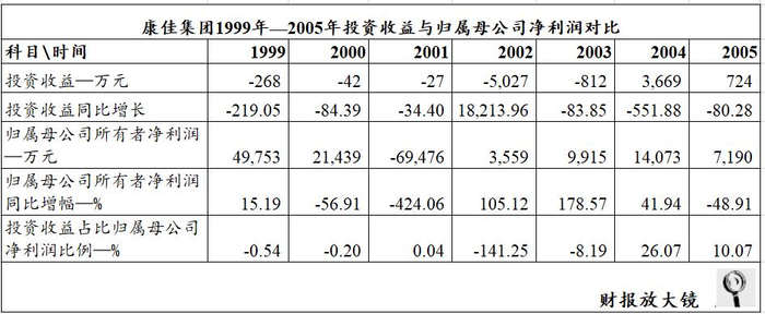 康佳集团1999年—2005年投资收益与归属母公司净利润情况如下: