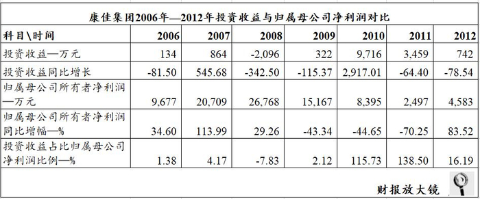 康佳集团2006年—2012年投资收益与归属母公司净利润情况如下: