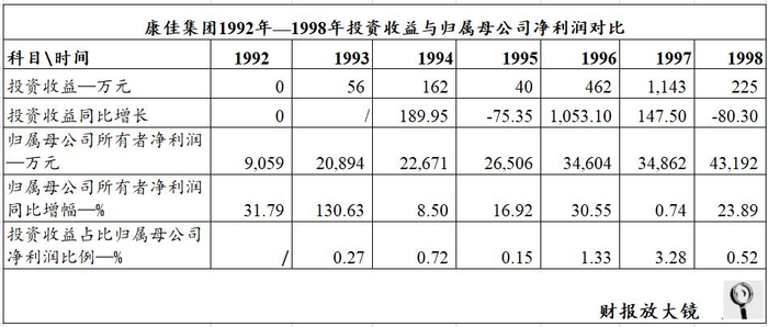 1992年—1998年,康佳集团投资收益数额相对较少,最高为1997年的1,143万元,其余年份投资收益金额均在几十万到几百万不等,对业绩影响较小。