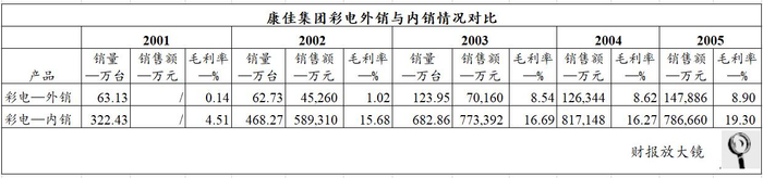 2004年后,康佳集团年报不再公告彩电外销数量,但从毛利率及销售额对比来看,2002年关闭的三家海外公司(美国康佳电子有限公司、康佳电子(印度)有限公司、太平洋康佳有限公司),并未对康佳集团彩电海外销售造成不良影响。