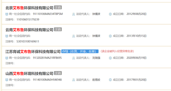 从企信网也可以发现,以地区加艾布鲁环保的公司不断进入经营异常名录而注销,也可见艾布鲁业务出省的不容易,缺失省内的某些竞争力,其获得省外订单的难度可谓不小,整体公司运营可持续发展的前景或难乐观。