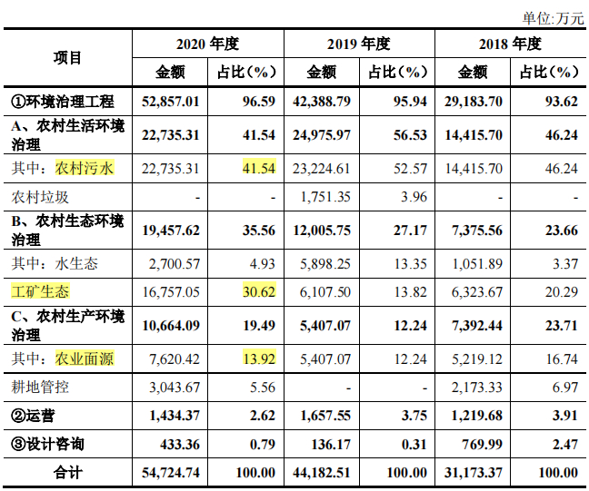 其中,环境治理工程为公司的核心业务,报告期内,公司环境治理工程收入分别为2.92亿元、4.24亿元和5.29亿元,占比分别为93.62%、95.94%和96.59%。