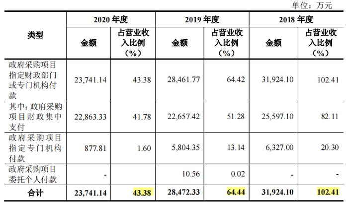 2018年-2020年,艾布鲁对政府机构和国有企业的收入金额占当期主营业务收入的比例分别为98.62%、100.00%和99.69%,占比较高,公司客户多为项目所在地的政府机构和国有企业(主要为地方政府投融资平台),资金来源于财政拨款,付款方主要为政府指定的财政部门或专门机构,公司销售第三方回款主要为政府采购项目指定财政部门或专门机构付款类型,该类回款占比分别为102.41%、64.42%和43.38%,占比较高。