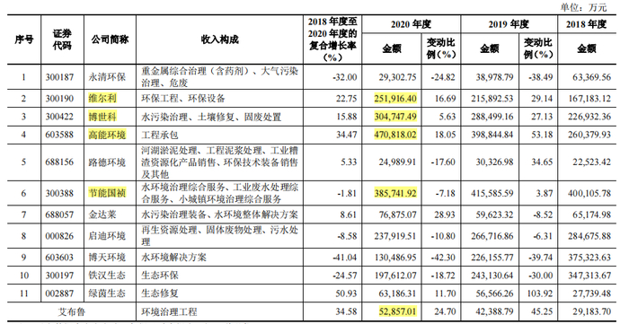 主营业务主要分为环境治理工程和运营、设计咨询三大类,2018年-2020年艾布鲁的营业收入分别为3.12亿元、4.42亿元和5.47亿元,2019年、2020年,公司营业收入分别较上年度增长41.73%、23.86%;净利润分别为3819万元、5448.63万元和6962.44万元,2019年和2020年较上年增长42.67%和27.78%,公司营收和净利润处于增长状态,但是对比同行十几亿或几十亿的营收规模而言,公司的体量较小。