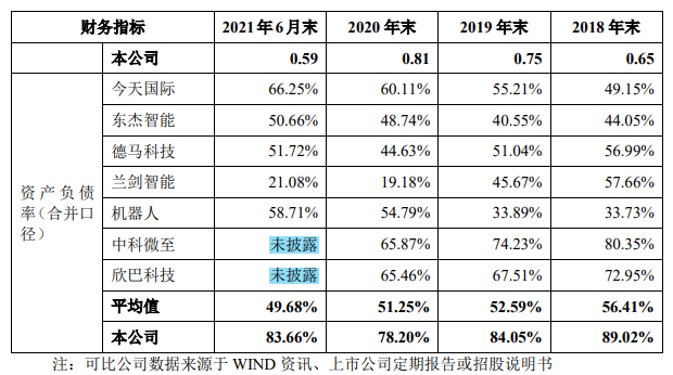 科捷智能报告期各期末合并口径资产负债率分别为89.02%、84.05%、78.20%和83.66%,有所下降,但仍高于同行业平均水平。分别体现在应收账款加大,存货加大,和初创期的亏损抵消,导致各期末净资产规模偏小。