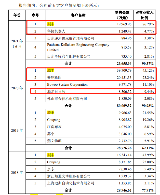 报告期内,科捷智能来源于前五名客户的营业收入分别为2.89亿元、2.87亿元、8.01亿元及2.37亿元,占营业收入的比例分别为77.91%、62.11%、90.98%和90.37%,客户集中度较高。其中,2018-2020年、2021年1-6月报告期内,第二大股东和第一大客户顺丰集团分别贡献了1.63亿元、9,966.63万元、3.97亿元和2.0亿元,占比分别为43.99%、21.55%、45.12%和76.29%。