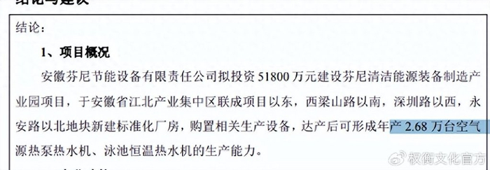芬尼清洁能源装备制造产业园项目总投资5.18亿元,其中:建设投资4.534亿元,铺底流动资金6,463.60万元。本项目建设完成后将形成年产泳池恒温热泵130,435台,北极星系列热泵8,929台,KV系列热泵热水机31,250台,商用水机9,375台的生产能力。而芜湖市生态环境局2020年3月17日公示的环保报告中则称公司于安徽省江北产业集中区新建标准化厂房,达产后可形成年产2.68万台空气源热泵热水机、泳池恒温热水机的生产能力,两者信披相差甚远。