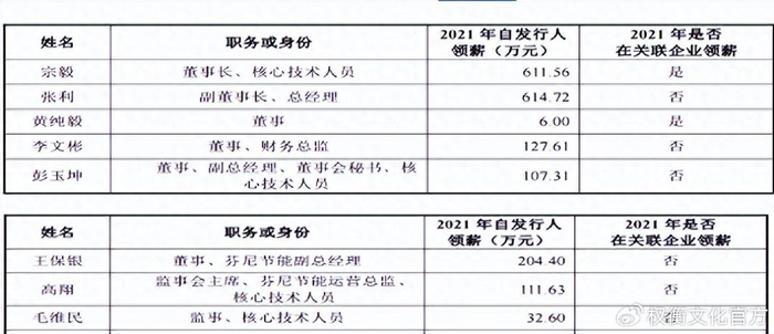 2021年,宗毅和张利领取薪酬分别为611.56万元和614.72万元,薪酬超200万元的高管1名,薪酬超100万元的高管中有4人,2021年公司董监高的薪酬达2200.25万元。