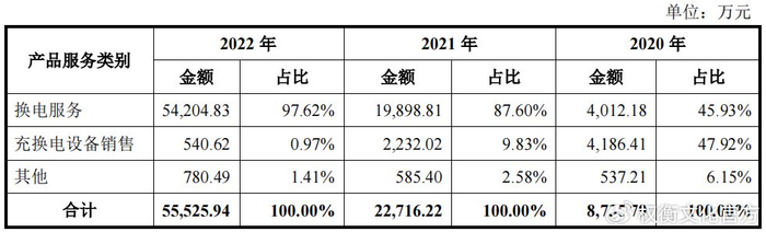 2020年-2022年,公司换电服务收入分别为4012.18万元、1.99亿元和5.42亿元,占比分别为45.93%、87.60%和97.62%。