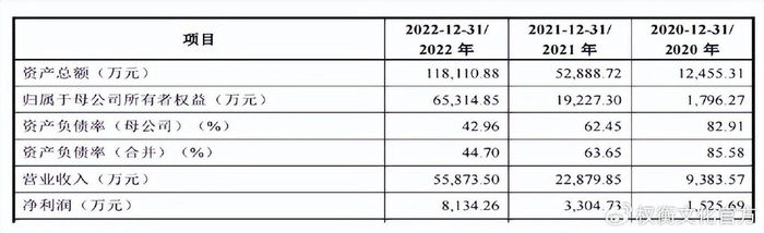 截至2022年末,公司资产总额为11.81亿元。报告期各期,母公司资产负债率分别为82.91%、62.45%和42.96%。报告期各期末,公司流动比率分别为0.41、0.65和1.15,速动比率分别为0.24、0.53和0.92。2020年和2021年,公司流动比率、速动比率低于可比上市公司平均水平,资产负债率高于可比上市公司平均水平。