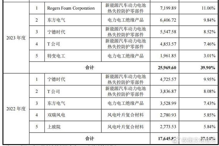 报告期内,固德电材对前五名客户的销售总额占比分别为37.14%、39.90%、44.27%和41.94%。其中东方电气,宁德时代、T公司和特变电工常居前五大。