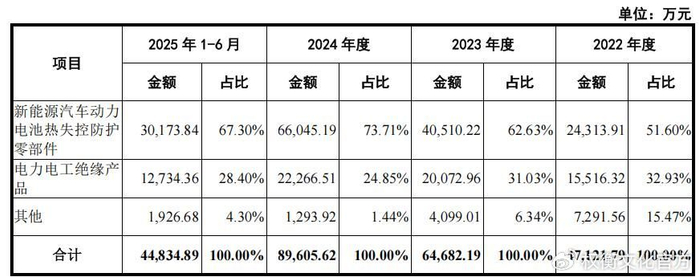 报告期内,固德电材新能源汽车动力电池热失控防护零部件业务收入分别为2.431亿元、4.051亿元、6.605亿元和3.017亿元,占主营业务收入的比例分别为51.60%、62.63%、73.71%和67.30%,最近三年金额及占比均逐年上升,是公司主营业务收入的主要来源。2025年1-6月,受关税政策频繁变动影响,新能源汽车动力电池热失控防护零部件产品的外销收入占比下降,进而导致该类产品收入和占比略有下滑。