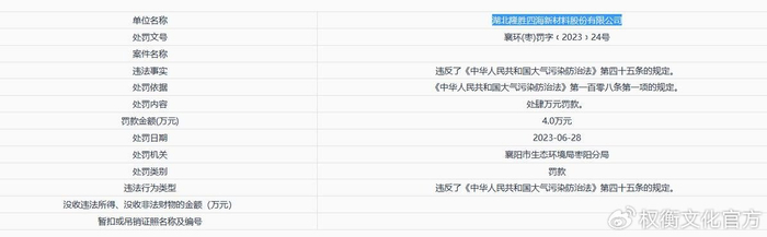 湖北隆胜四海新材料股份有限公司常年为公司提供树脂,交易额为856.14万元、1,466.67万元和1,297.21万元,占比3.70%、5.27%和3.65%。据环保资料显示,2023年6月28日,环保局因其废气污染处罚4万元。