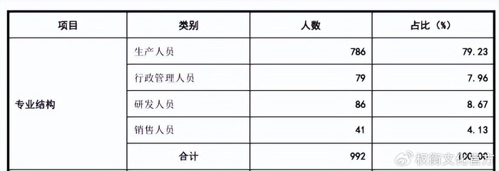 截至2025年6月30日,公司员工的构成中,生产人员高达786人,占比达79.23%。研发为86人,占比8.67%,不及高新企业要求的研发技术人员10%占比。