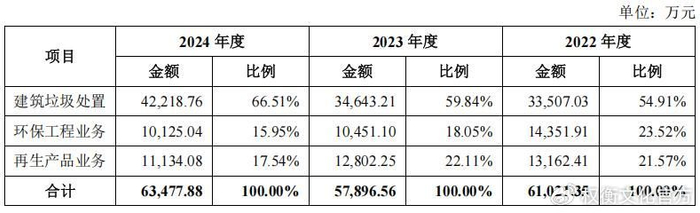 建工资源主营业务为建筑垃圾处置、环保工程业务及再生产品业务。报告期内建筑垃圾处置收入占比分别为54.91%、59.84%和66.51%,环保工程及再生产品业务收入金额及占比逐期下降,其中再生产品中再生流态回填材料报告期内销量持续增长,其他产品销量呈下滑趋势。