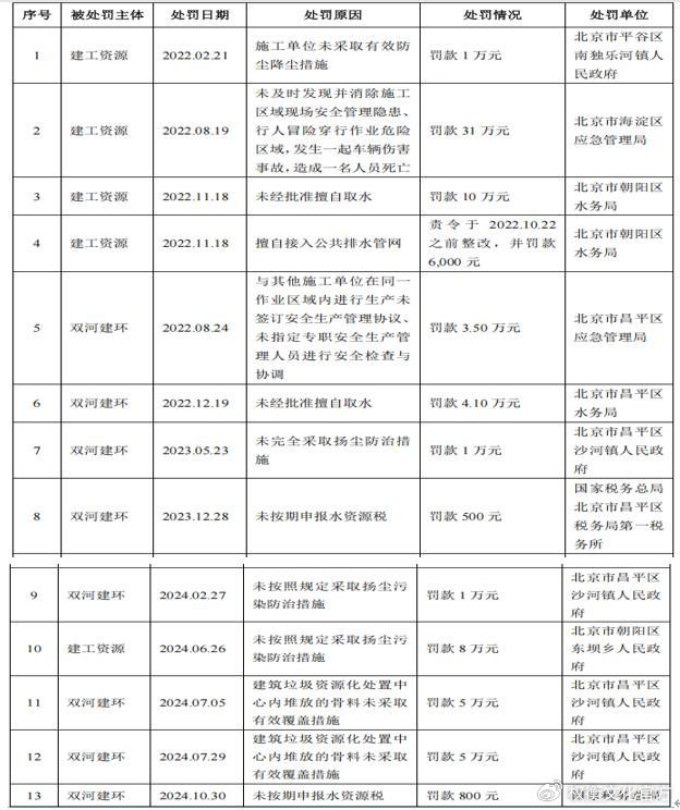 报告期内,建工资源收到北京市应急管理局、税务局、水务局等部门行政处罚,处罚多达13次。其中罚款值10万及10万以上的有两次,5万元-10万元有3次。