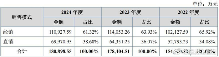 报告期内,公司经销模式收入占主营业务收入的比例分别为65.92%、63.93%和61.32%。公司重视对经销商网络的维护及日常管理,按照区域对经销商进行跟踪管理。经销收入中非法人经销商占比31.02%、25.91%、21.40%、19.85%,19家经销商系前员工设立、1家经销商系关联方。