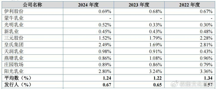 报告期各期,南方乳业研发费用率分别为0.57%、0.65%和0.67%,低于同行业可比公司平均数1.34%、1.22%和1.24%。截至2025年4月30日,公司及其子公司拥有已授权专利13项,均为实用新型或外观设计专利,并无发明专利。