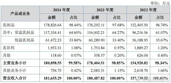 公司主要产品包括低温乳制品、常温乳制品、含乳饮料及其他乳制品,并对外销售部分生鲜乳。报告期内,公司主营业务收入分别为15.492亿元、17.84亿元及18.09亿元,各期乳制品业务占比均保持在95%以上。