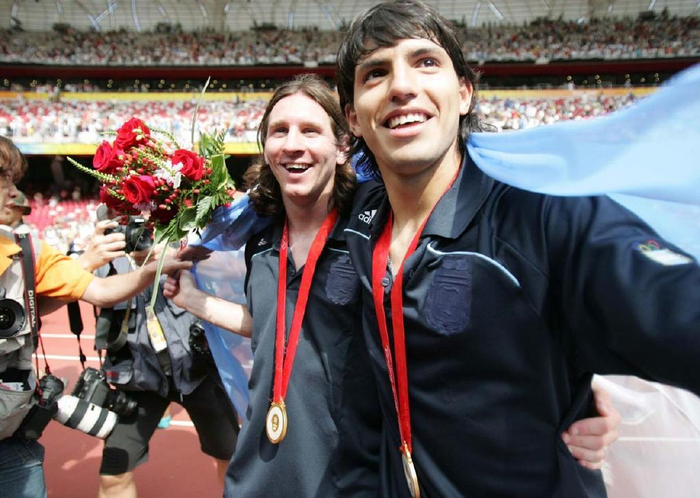2008年北京奥运会上,阿根廷赢得足球比赛金牌,梅西和他的队友塞尔吉奥·阿圭罗身披国旗庆祝。