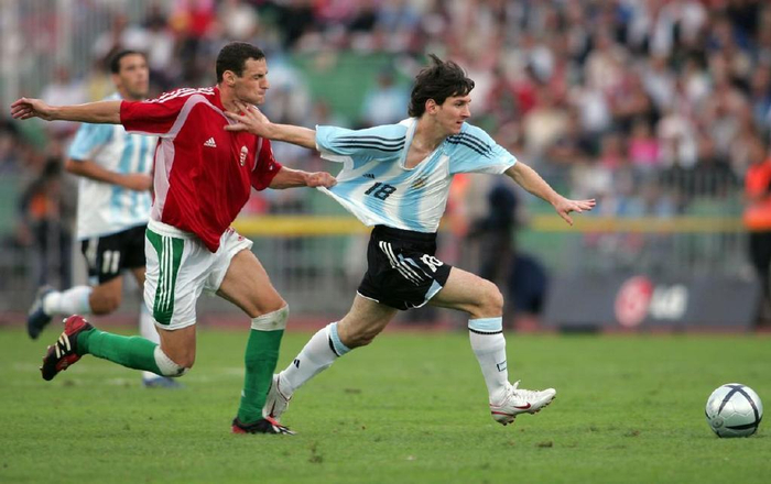 2005年8月,梅西在对匈牙利的比赛中完成了他代表阿根廷国家队的首秀。他在第63分钟替补上场,但仅仅两分钟后就因被认为是对对方后卫肘击而被红牌罚下。