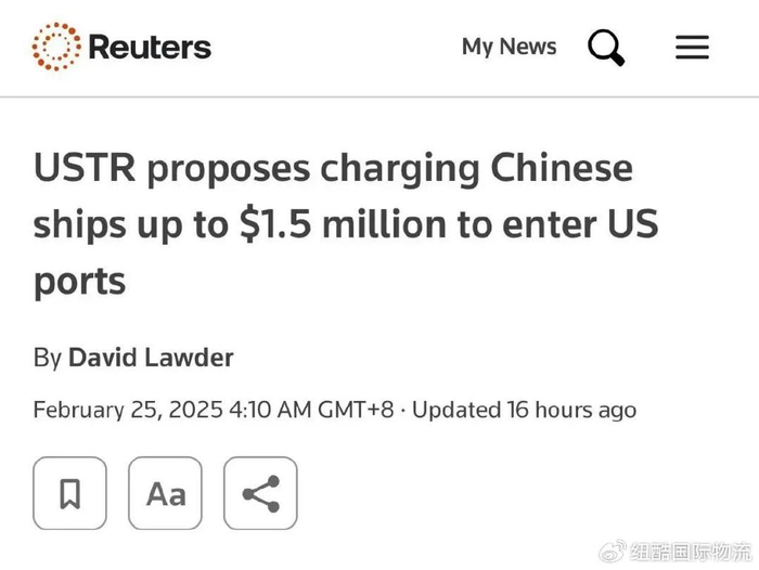 根据路透社报道,美国贸易代表办公室(USTR)提议对进入美国港口的中国制造船只收取最高达150万美元的费用。行业认为这些费用可能会推动更多货物通过加拿大和墨西哥运输,从而抵消即将对这两个国家征收25%关税的影响,美国的进口将面临成本增加。