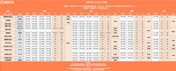 温哥华方面:YVR2预约难,逐步恢复正常;YVR3预约难,有删约情况,仓库收货情况逐渐好转;YVR4预约难。卡尔加里方面:YYC6严重爆仓,预约在2周后;YEG2爆仓,预约少;YYC4爆仓,有删约情况;YEG1目前情况正常。多伦多方面:YOO1持续爆仓;YYZ4难预约,预约在2周后,YOW3开始删约,预约难拿;YGK1 、YYZ3情况正常。