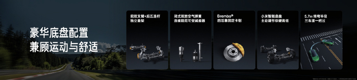 除了强大的电机,还有强大的底盘。首先在制动表现上,小米YU7 100km/h-0 最短制动距离 33.9 m,这个刹车距离和保时捷 911 相当,SUV有比肩百万跑车的制动能力,同时具备四重制动安全机制加持,带来更稳定、更安全的制动性能。其次在底盘配置上,小米YU7 配备了更高规格的底盘硬件,包含前双叉臂+后五连杆独立悬架、闭式双腔空气弹簧+连续阻尼可变减振器、Brembo 四活塞固定卡钳、小米智能底盘等,5.7m 转弯半径三车道一把过。具体来看,连续阻尼可变减振器可精准匹配路况需求,快速调节阻尼力,刚柔并济,更舒适也更运动,调节范围比小米SU7 Max 提高 10 %,阻尼带宽更大,实现蜿蜒山路、城市高架、城郊烂路全场景路况覆盖;闭式双腔空气弹簧支持 5 挡高度调节、最大上下调节范围 75 mm,离地间隙最高 222 mm,同时也可以快速调节空气弹簧刚度,超 40% 高低刚度差,在保持路感的同时还能做到更舒适。