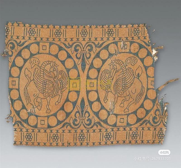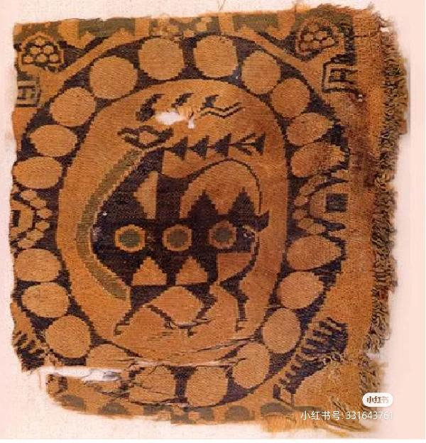 在后期这种纹路也是有演进的,比如后期出土的文物,在新疆吐鲁番的阿斯塔那墓出土的丝绸,里面就有一篇联珠对龙纹绫带着“景云元年”(710年)的题记。
